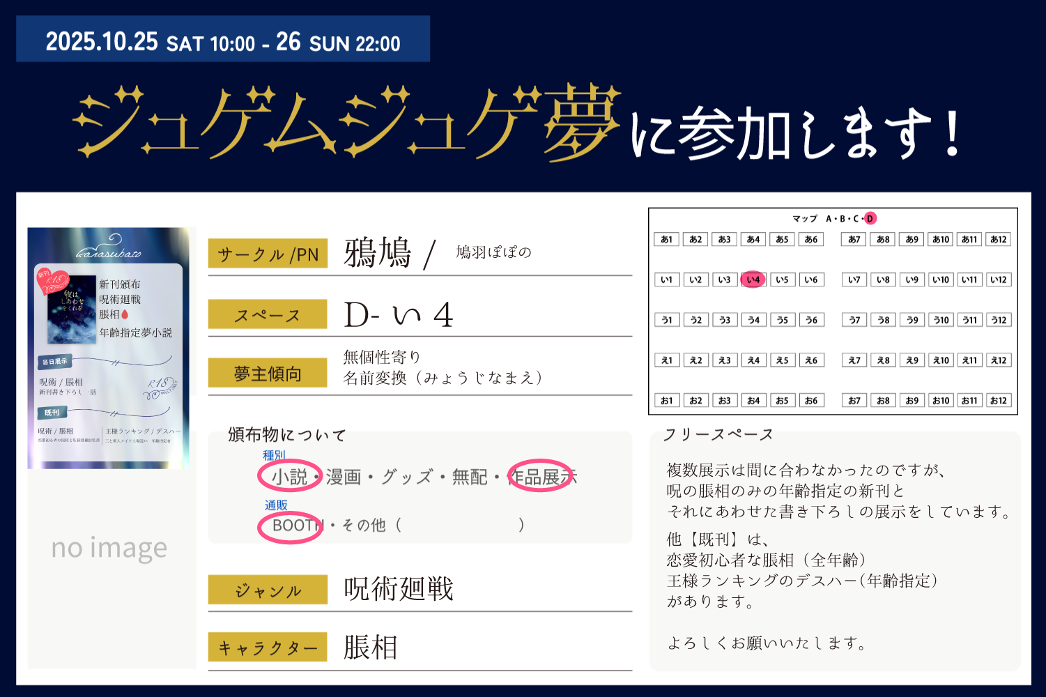 ↑来年の2月に初めて東京のリアイベに参戦します!!脹夢!!!!!!東京ビッグサイトで僕と握手!!!!(ボッチ確定なので、誰かスペースに来てください…)現在連載途中の脹相×一般人女性の連載を完結させ本にします。
